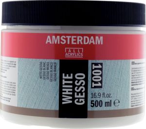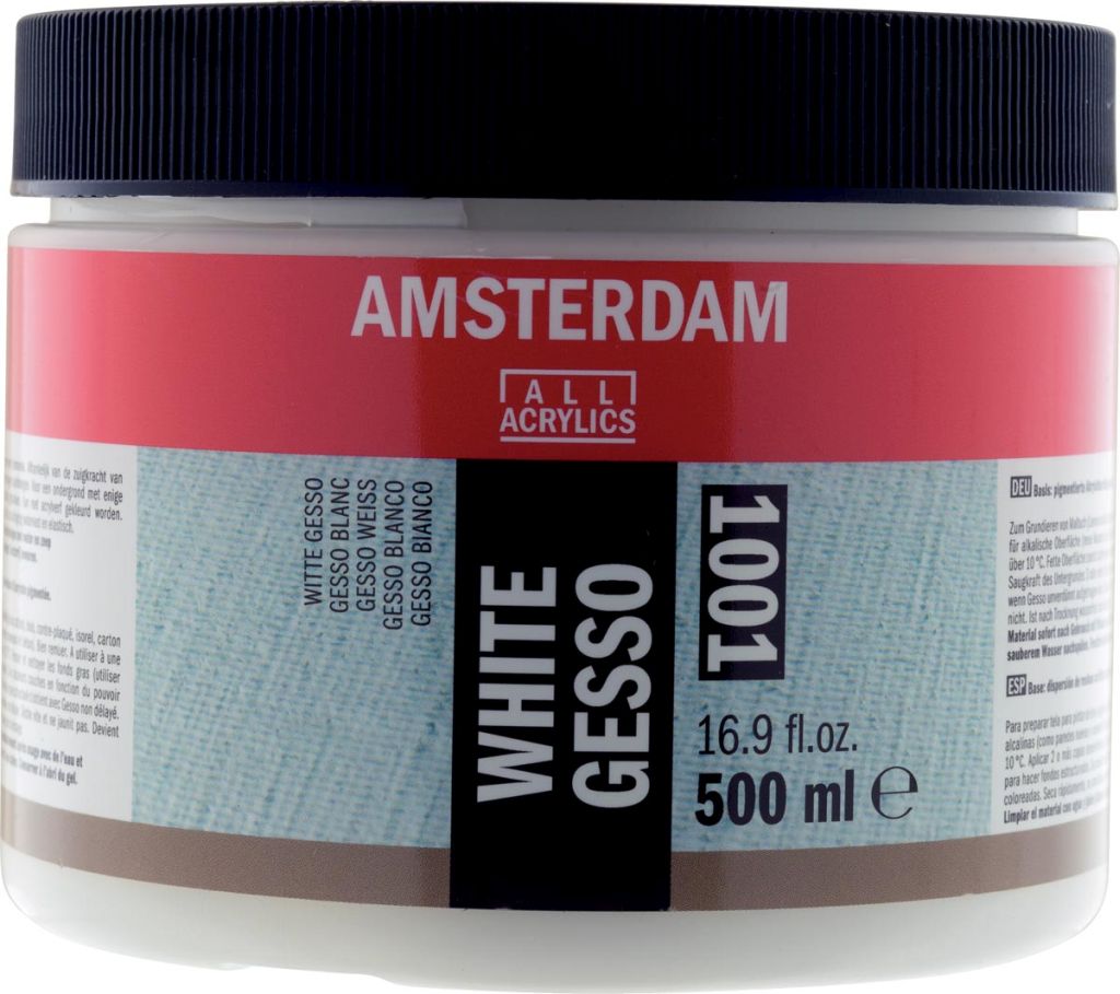- Samenstelling: acrylaatharsdispersie, titaandioxide Bijzonderheden: Zorgt voor een goede hechting van onder andere acryl-, olie- en plakkaatverf Geschikt voor stof- en vetvrije absorberende ondergronden, zoals schilderdoek (linnen, katoen etc.), hout, multiplex, hardboard, karton en papier Geschikt als preparering voor muurschilderingen op al dan niet alkalihoudende ondergronden zoals vers beton, stucwerk en baksteen Sterk absorberende ondergronden eerst voorstrijken met Amsterdam acrylbindmiddel 005 Kan gemengd worden met andere Amsterdam gesso's Kan met acrylverf aangekleurd worden Verdunbaar met water Na droging watervast Verwerken boven 10° C Vorstvrij bewaren Gereedschap reinigen met water pot van 500 ml, wit