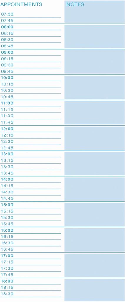 - Op de linkerpagina een tijdsplanner met daarnaast ruimte voor notities