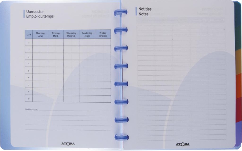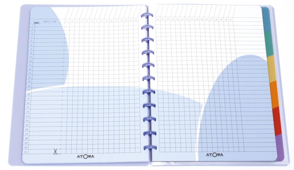 - 2-talig Wit papier van 80 g/m² Met ringen ATOMA 160 pagina's Eeuwigdurend Met weekplanning, puntenboekje en bladwijzer Kaft uit transparante PP in geassorteerde kleuren: rood, paars, lichtgroen, turkoois en blauw Keuze kleur niet mogelijk Ft 21 x 29,7 cm (A4) Certificaat: FSC Mix ft 16,5 x 21,5 cm (A5+)