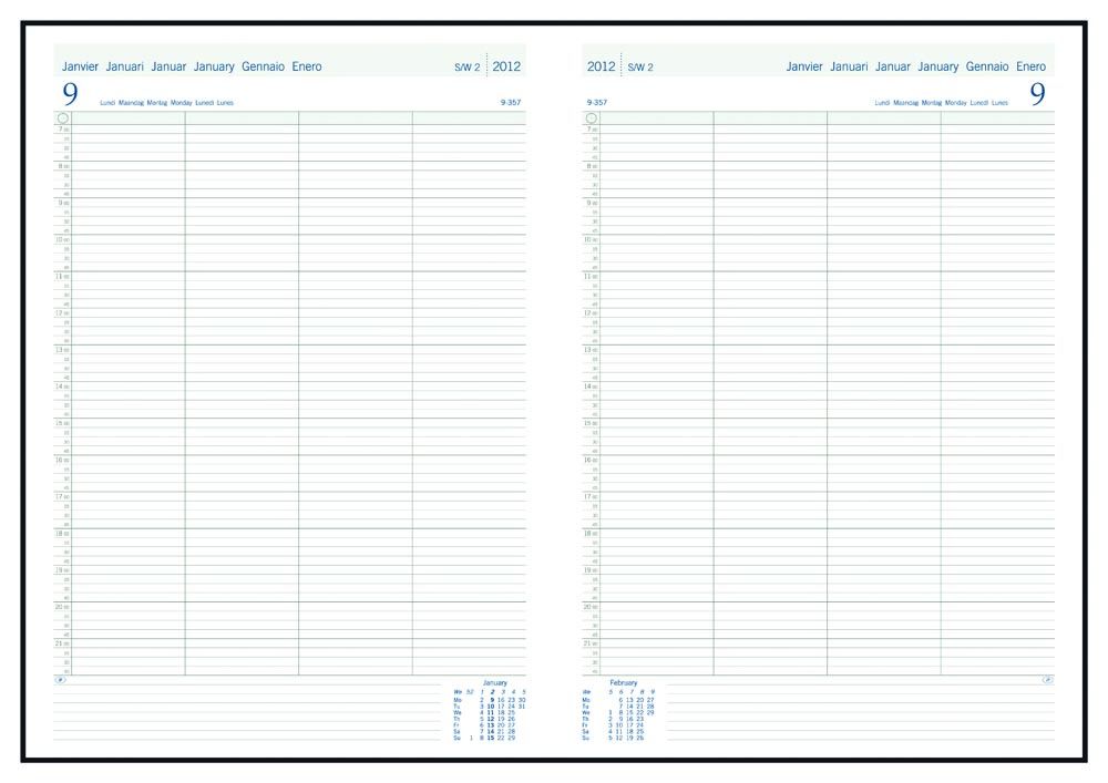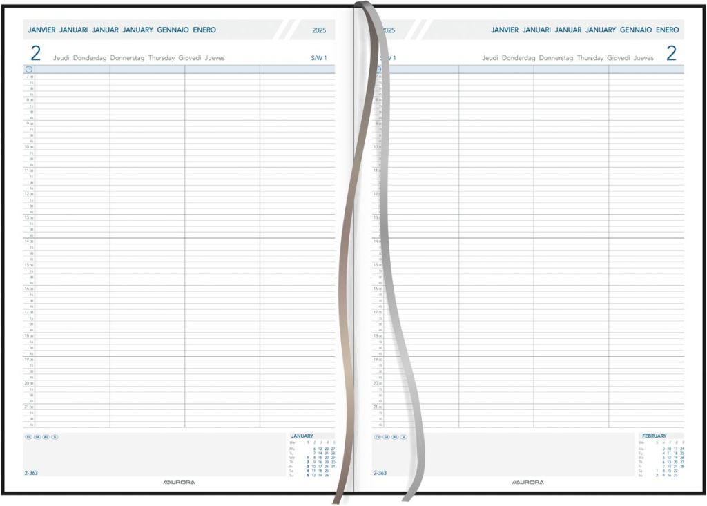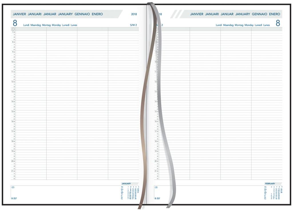 - 1 dag per 2 pagina's Kwartierindeling (7u - 22 u) 6-talig Genaaid met garen Wit papier van 80 g/m² 768 pagina's 2 leeslinten en kapitaalbandjes Met geperforeerde hoeken Gekartonneerde kunstlederen omslag Ft 215 x 295 mm Florence, zwart