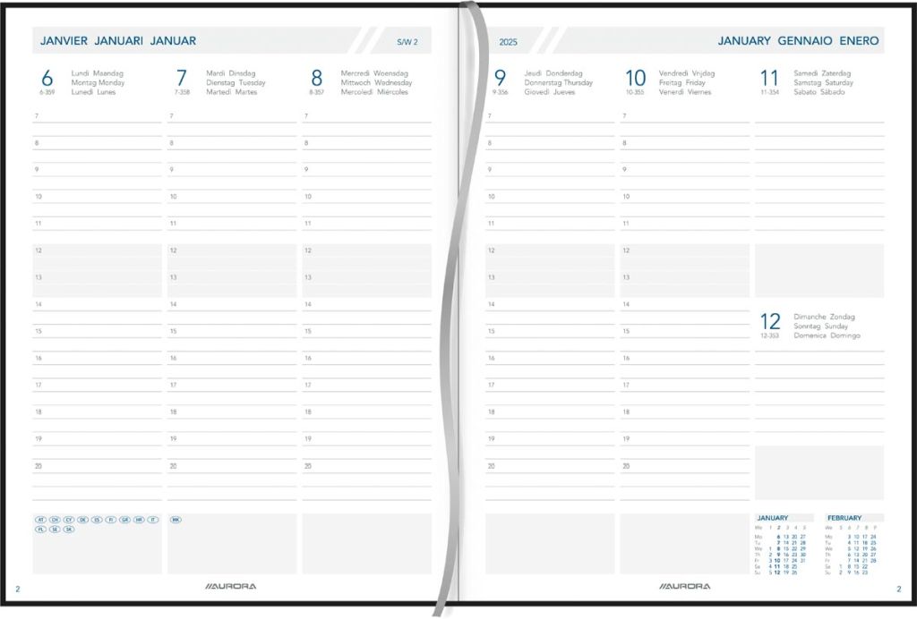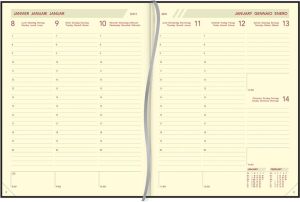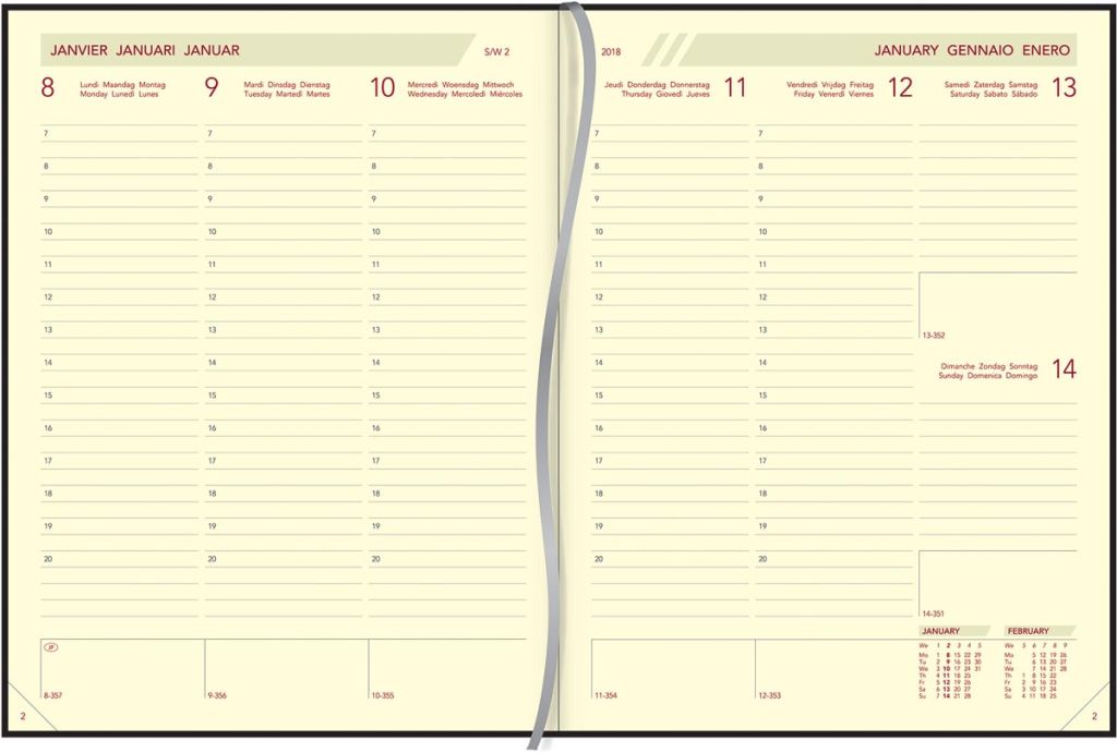 - 1 week per 2 pagina's 14 maanden Halfuurindeling (7u - 21u) 6-talig Genaaid met garen Wit papier van 80 g/m² 144 pagina's Met geperforeerde hoeken en leeslint Gewatteerde kunstlederen omslag Ft 175 x 225 mm Certificaat: FSC Florence, zwart