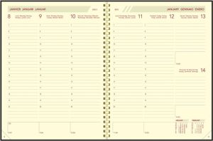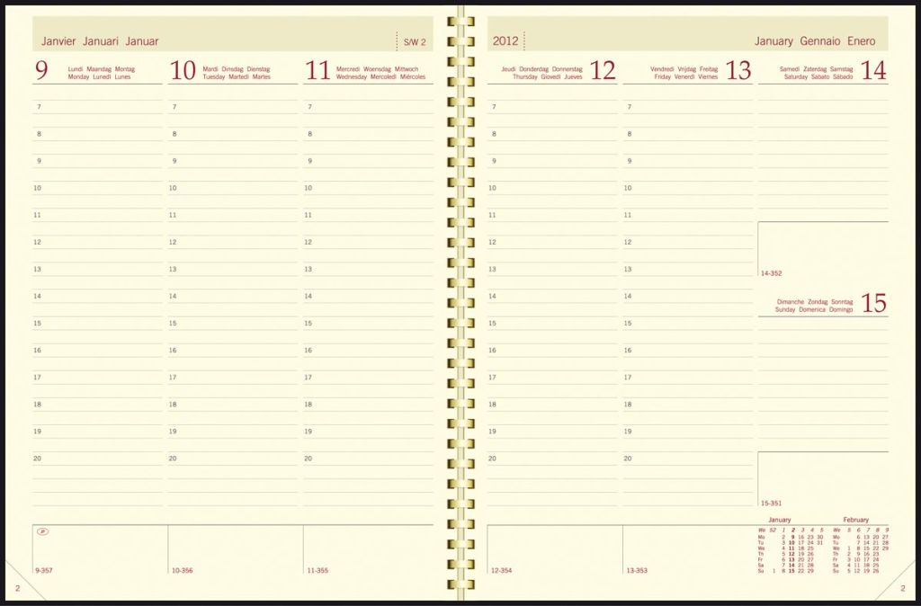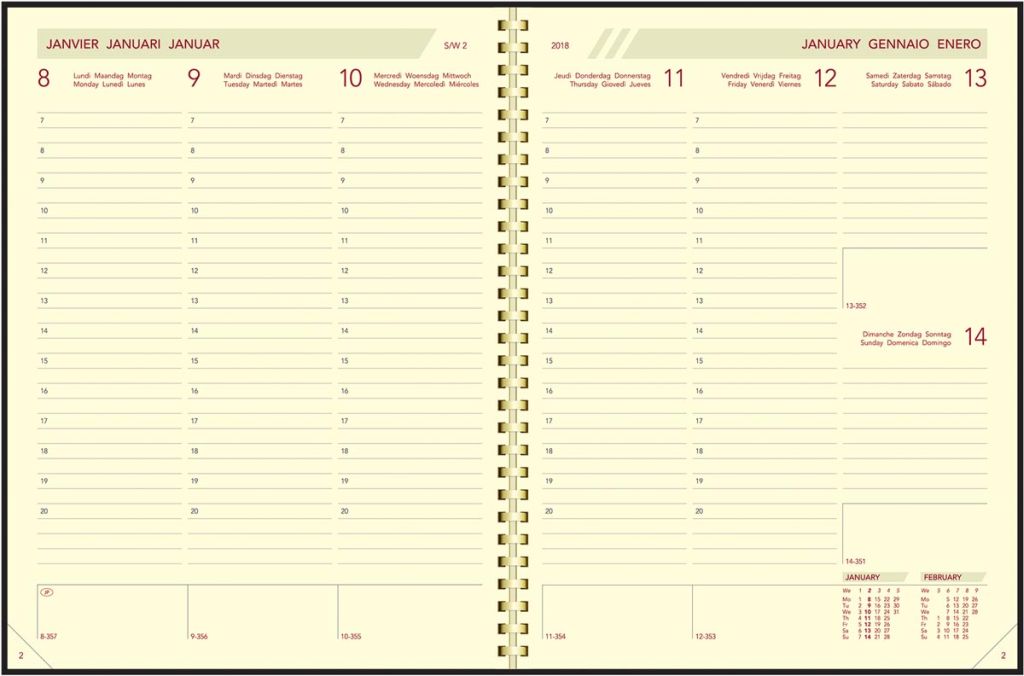 - 1 week per 2 pagina's 14 maanden Halfuurindeling (7u - 21u) 6-talig Plastiek spiraalbinding Wit papier van 80 g/m² 144 pagina's Met geperforeerde hoeken Onder etui Ft 175 x 225 mm Alaska, geassorteerde kleuren: bordeaux, blauw en zwart