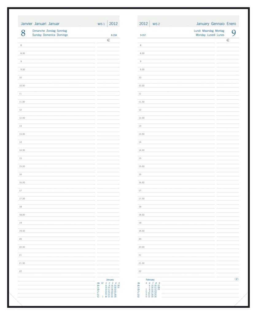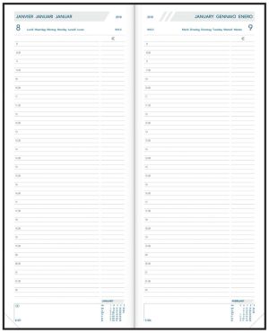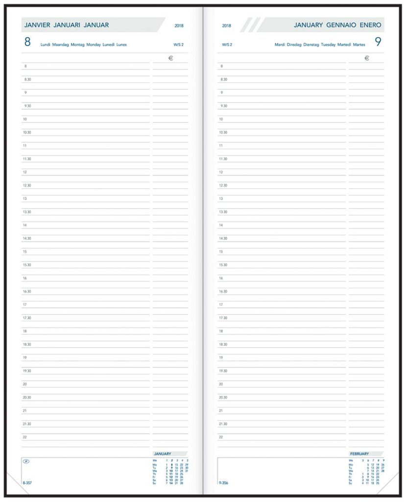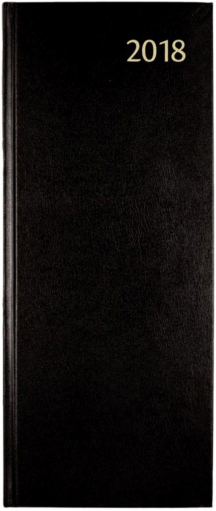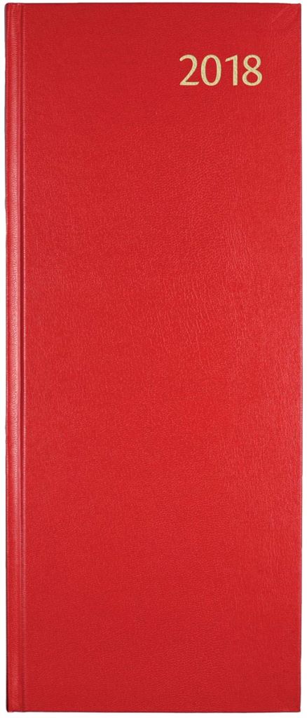 - 1 dag per pagina 6-talig Genaaid met garen Wit papier van 70 g/m² 416 pagina's Met schoolvakanties Gelijnd Met mogelijkheid tot invullen van bedragen Met geperforeerde hoeken Gekartonneerde omslag Ft 140 x 340 mm Certificaat: FSC Balacron, geassorteerde kleuren: rood, blauw en zwart (Keuze kleur is niet mogelijk)