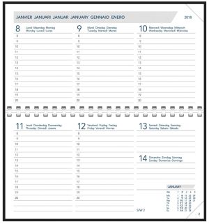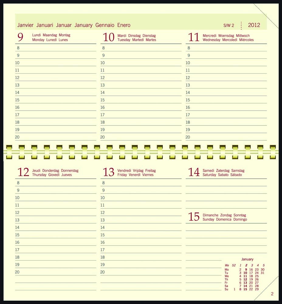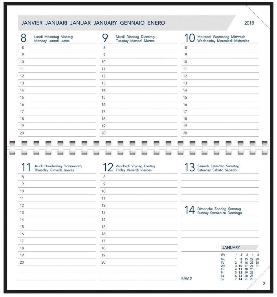 - 1 week per 2 pagina's Uurindeling (8u - 20u) 6-talig Plastiek spiraalbinding Wit papier van 80 g/m² 144 pagina's Liggende lay-out 16 pagina's Europa-Atlas Verwisselbaar alfabet van 16 pagina's Met geperforeerde hoeken Onder etui Ft 165 x 90 mm Certificaat: FSC Alaska, geassorteerde kleuren: bordeaux, blauw en grijs