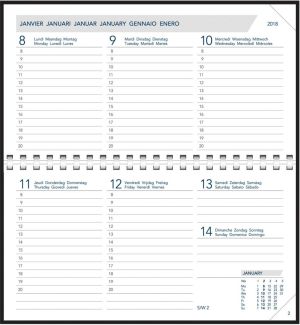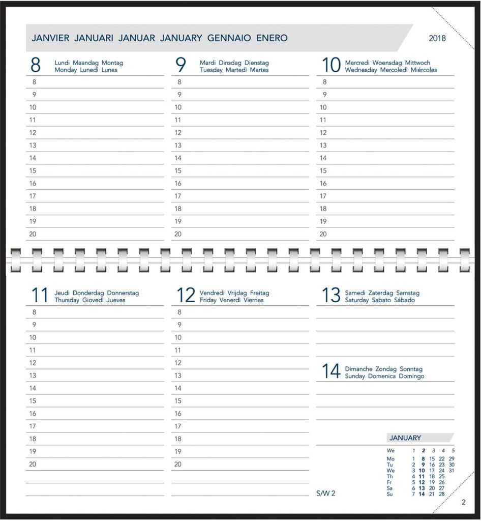 - 1 week per 2 pagina's Uurindeling (8u - 20u) 6-talig Plastiek spiraalbinding Wit papier van 80 g/m² 144 pagina's Liggende lay-out 16 pagina's Europa-Atlas Verwisselbaar alfabet van 16 pagina's Met geperforeerde hoeken Onder etui Ft 165 x 90 mm Certificaat: FSC Seta, geassorteerde kleuren: bordeaux, groen, blauw en zwart