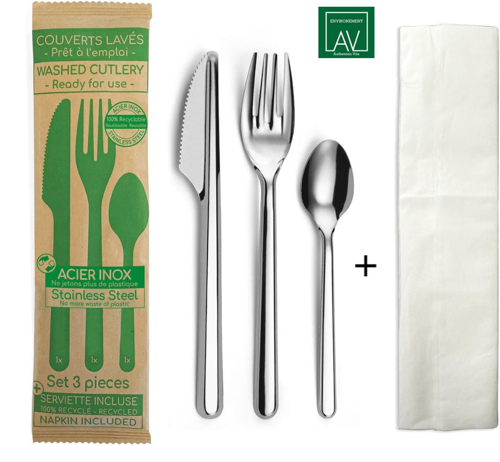 - 3-delige set: mes, vork en koffielepel Inclusief wit papieren servet Ecologisch roestvrij staal