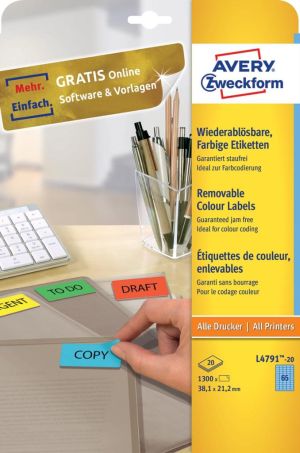 Avery gekleurde etiketten ft 38,1 x 21,2 mm (b x h), afneembaar, blauw, 1300 stuks, 65 per blad