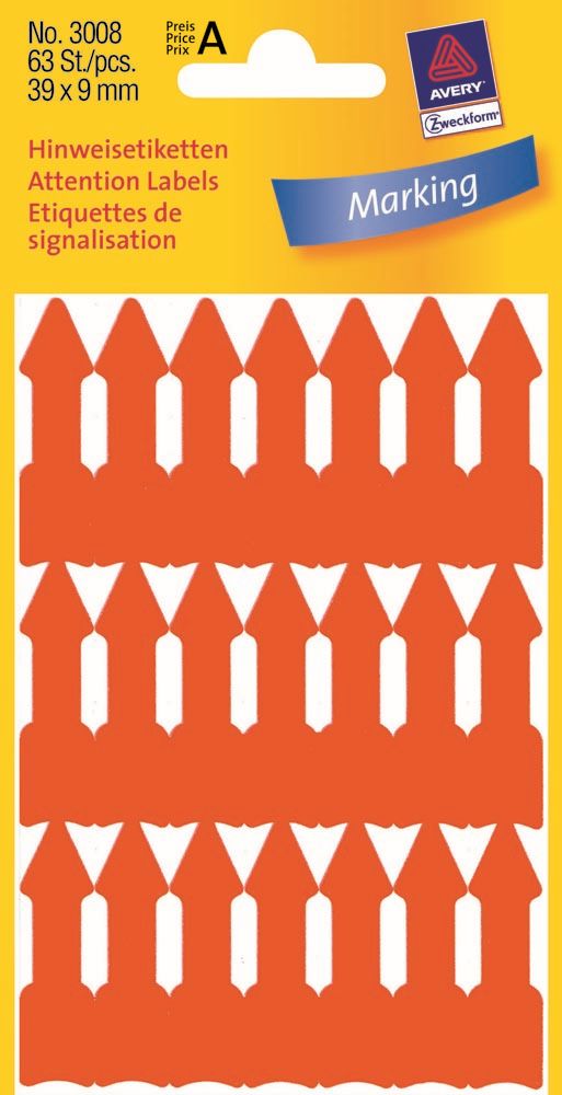 Avery Zweckform 3008, markeringspijlen, lichtrood, 3 vel, 63 per vel, 39 x 9 mm