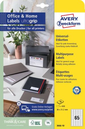 - Voor kopieermachines, laser- en inkjetprinters Met rechte hoeken Makkelijk te ontwerpen en te bedrukken dankzij de gratis Avery Design & Print software Ft 21 x 29,7 cm (A4) Pak van 10 vel FSC-gecertificeerd ft 38 x 21,2 mm, 650 stuks, ultragrip -technologie, wit