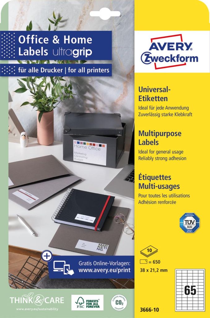 Avery Zweckform universele etiketten, 38 x 21,2 mm, wit, permanent klevend, 650 etiketten, 10 vellen