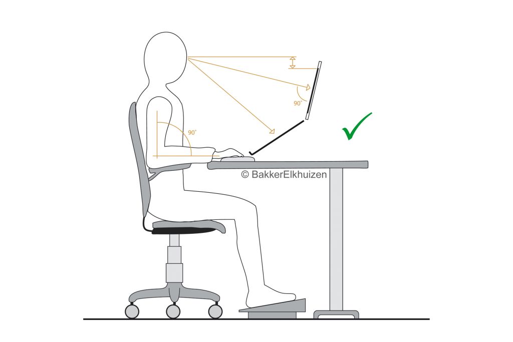 Indien de tafel niet instelbaar is, de bureaustoel op de juiste staat, en u toch niet bij de grond kunt, raden wij een voetensteun aan. Eenvoetensteun voorkomt namelijk dat de bloedvaten in de benen afgekneld worden. Bovendien draagt een voetensteun bij aan een goede werkhouding en wordt de bloedomsloop gestimuleerd.
