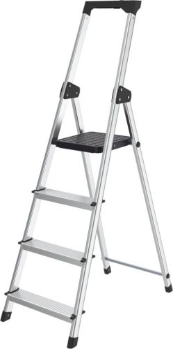 - Uit aluminium Onderste treden: 8 cm breed, bovenplateau (uit staal): 25 x 25 cm (met antislipmat) Draagvermogen: 150 kg Antislipvoetjes Kleur: zilver-zwart Warenwet gecertificeerd 4 treden, gewicht: 4,1 kg