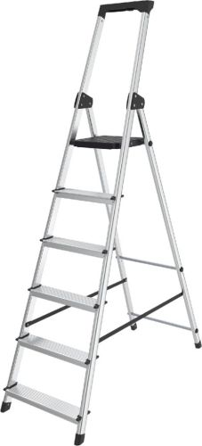 - Uit aluminium Onderste treden: 8 cm breed, bovenplateau (uit staal): 25 x 25 cm (met antislipmat) Draagvermogen: 150 kg Antislipvoetjes Kleur: zilver-zwart Warenwet gecertificeerd 6 treden, gewicht: 5,6 kg