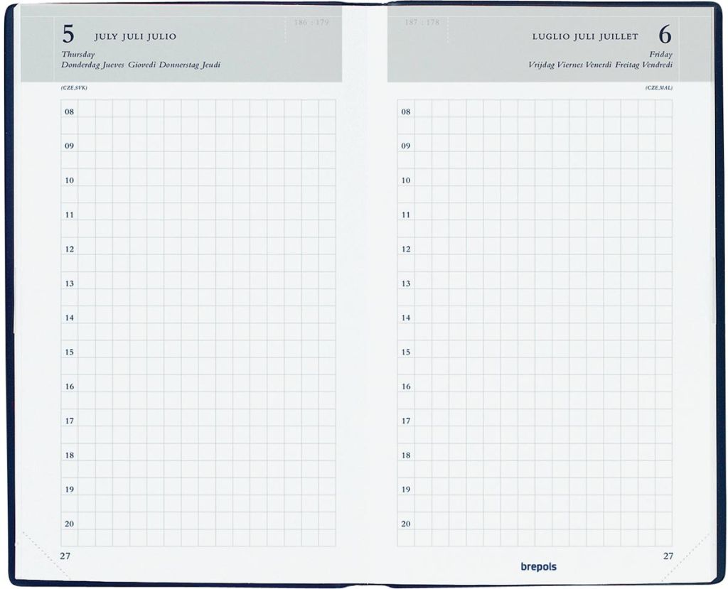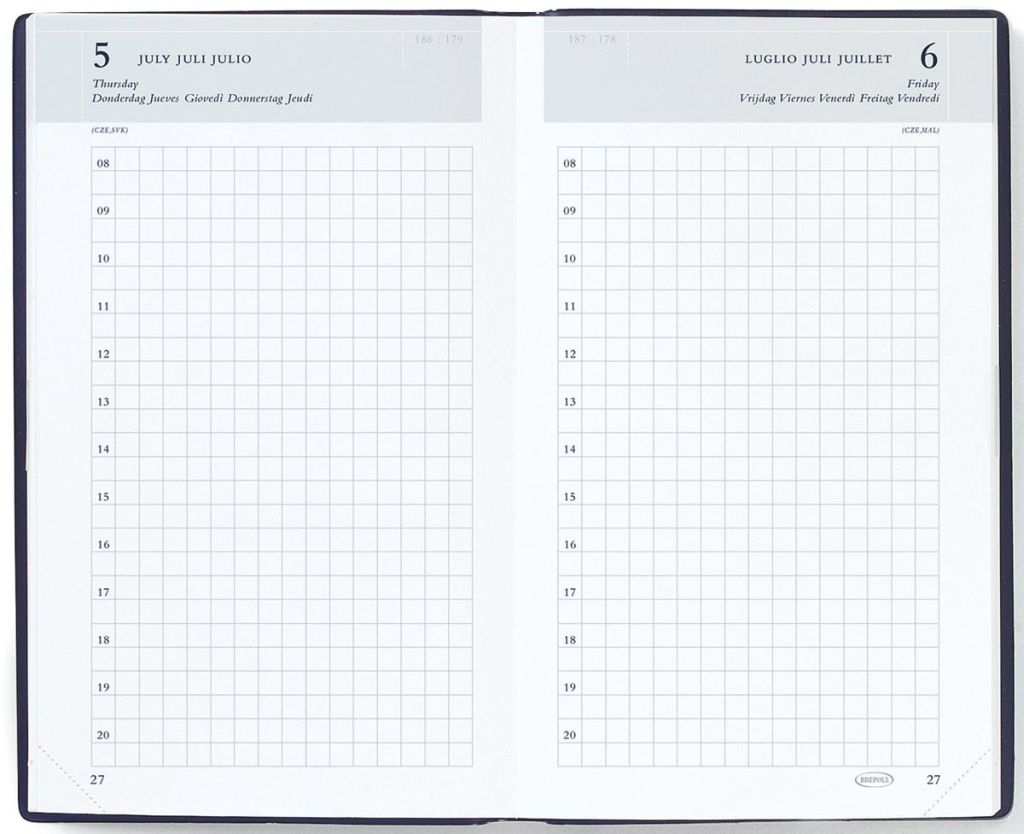 - 1 dag per pagina Uurindeling (8u - 19u) 6-talig Geruit Boekgebonden Wit papier van 60 g/m² 384 pagina's Kaft uit glad PVC met zijdeglans Met scheurhoekjes Met technisch compendium Ft 100 x 165 mm Seta, zwart