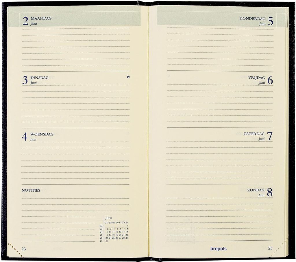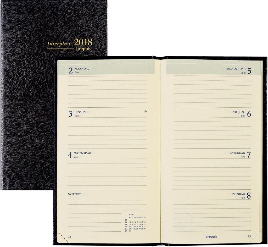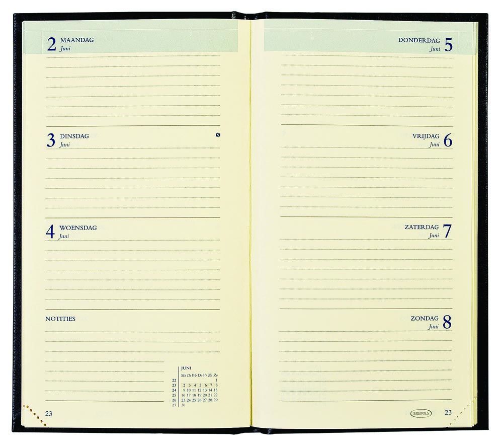 - 1 week per 2 pagina's 1-talig: Nederlands Boekgebonden Crèmekleurig papier van 60 g/m² Met scheurhoekjes Kaft uit effen kunstleder Ft 90 x 160 mm Lima, zwart