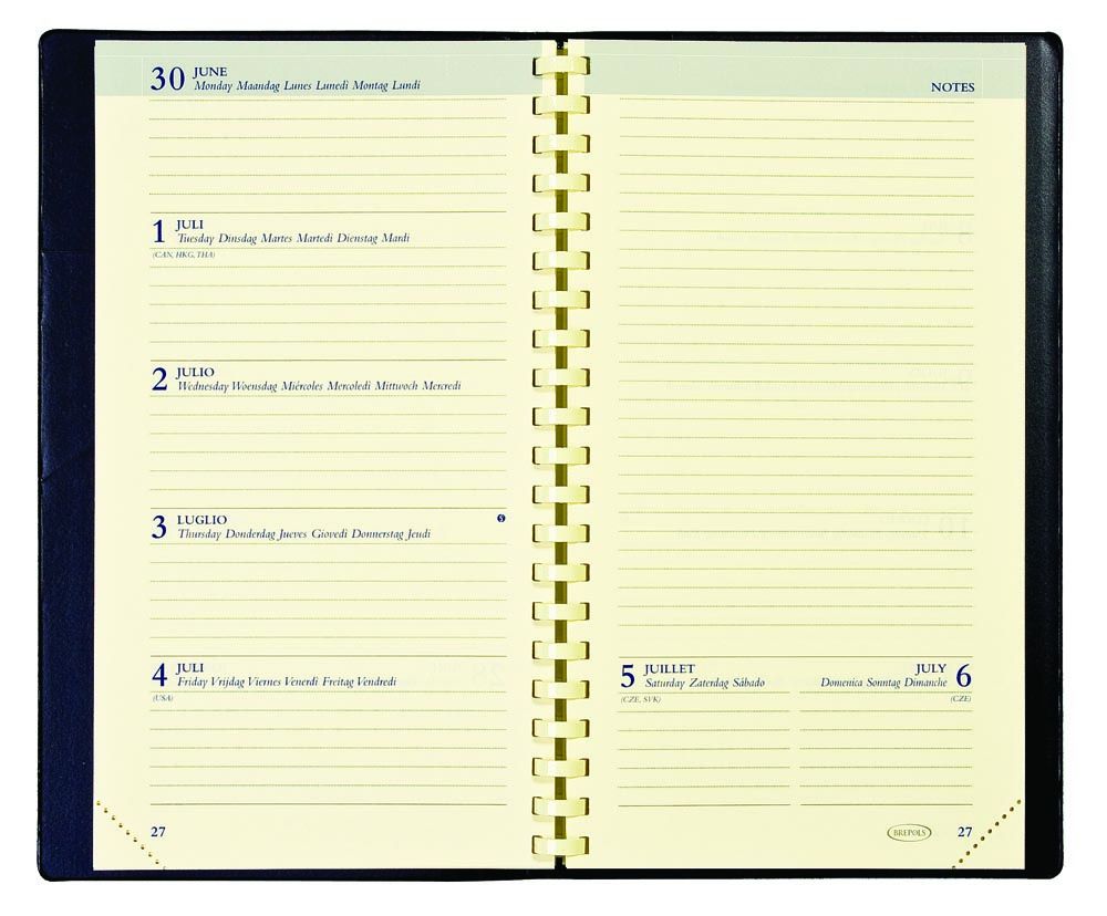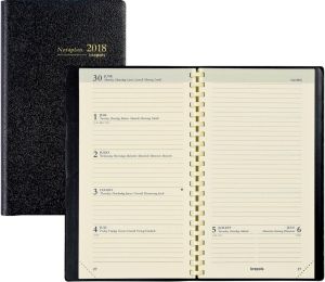 - 1 week per 2 pagina's 4-talig Spiraalgebonden Met extra notitieruimte op de rechtse pagina Crèmekleurig papier van 60 g/m² Met scheurhoekjes Kaft uit fijn generfd kunstleder Ft 89 x 160 mm Genova, kaft uit fijn generfd PVC, zwart