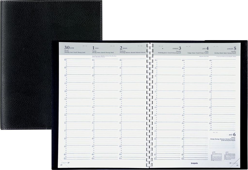 - 1 week per 2 pagina's Kwartierindeling (8u - 21u) 6-talig Spiraalgebonden Wit houtvrij papier van 70 g/m² 128 pagina's Met scheurhoekjes Kaft uit kunstleder met nappa nerf Ft 207 x 290 mm Calpe, zwart