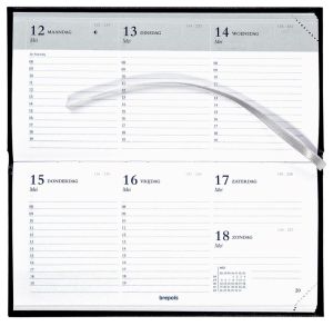 - 1 week per 2 pagina's Uurindeling (8u - 19u) Wit papier van 60 g/m² 1-talig: Nederlands Boekgebonden Horizontale lay-out 14 maanden Met leeslint en scheurhoekjes Kaft uit effen kunstleder Ft 81 x 166 mm Lima, zwart