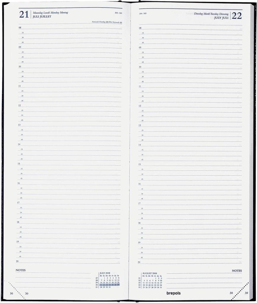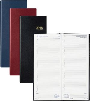 - 1 dag per pagina Kwartierindeling (8u - 20u) 4-talig Boekgebonden Wit houtvrij papier van 70 g/m² 400 pagina's Met scheurhoekjes Kaft uit effen kunstleder Ft 128 x 330 mm Certificaat: FSC Mix Lima, geassorteerde kleuren: bordeaux, blauw en zwart