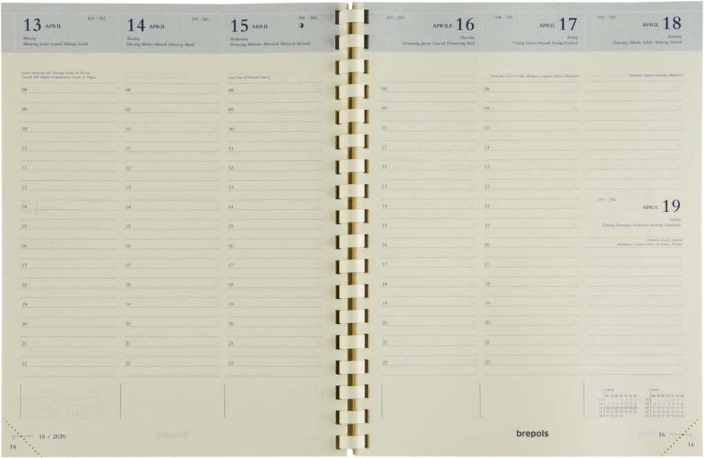 - 1 week per 2 pagina's Uurindeling (8u - 22u) 6-talig Spiraalgebonden Crèmekleurig papier van 70 g/m² Met scheurhoekjes Ft 171 x 220 mm Certificaat: FSC Mix