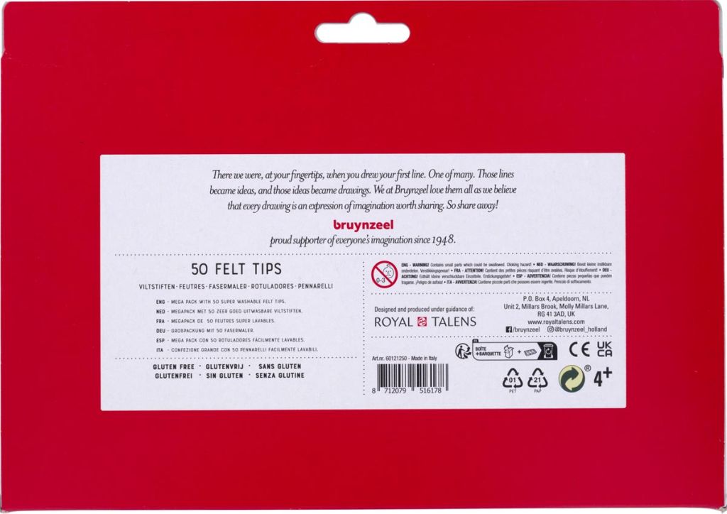 - Geschikt voor kinderen vanaf 5 jaar Uitwasbaar uit de meeste textielsoorten Inkt op waterbasis Droogt niet uit Glutenvrij In een kartonnen ophangetui 50 stiften