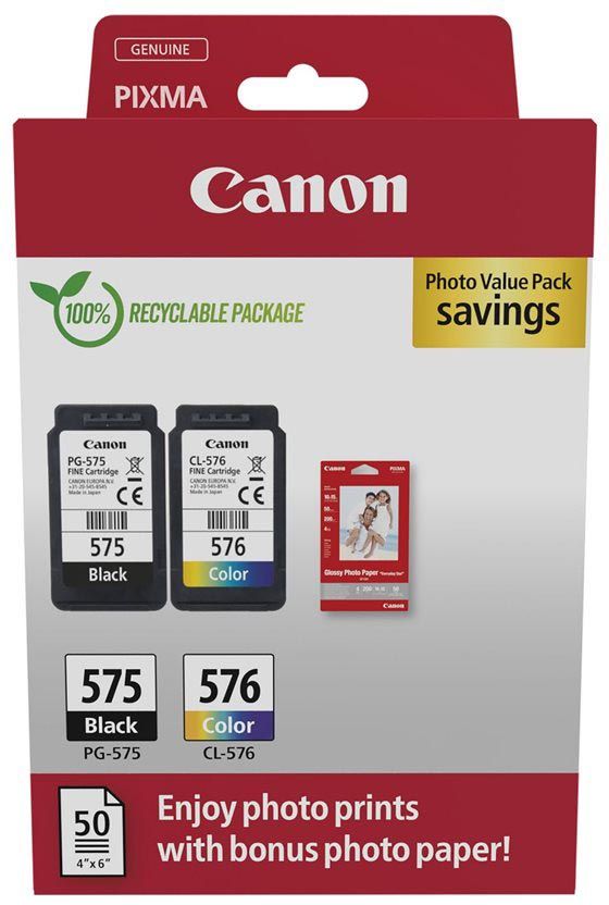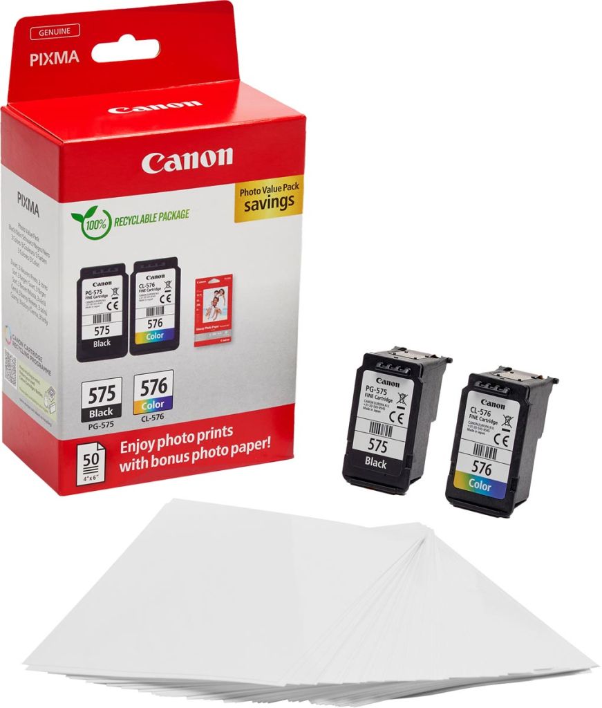 - Geschikt voor: PIXMA TS3550i, PIXMA TS3551i, PIXMA TR4750i, PIXMA TR4751i photo value pack PG-575 / CL-576, capaciteit: tot 100 pagina's, 4 kleuren + fotopapier (ft 10 x 15 cm, 50 vel)
