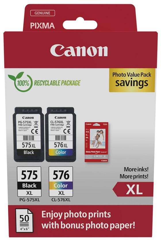 - Geschikt voor: PIXMA TS3550i, PIXMA TS3551i, PIXMA TR4750i, PIXMA TR4751i photo value pack 2 x PG-575XL / CL-576XL, capaciteit: 300 tot 400 pagina's, 4 kleuren+ fotopapier (ft 10 x 15 cm, 50 vel)