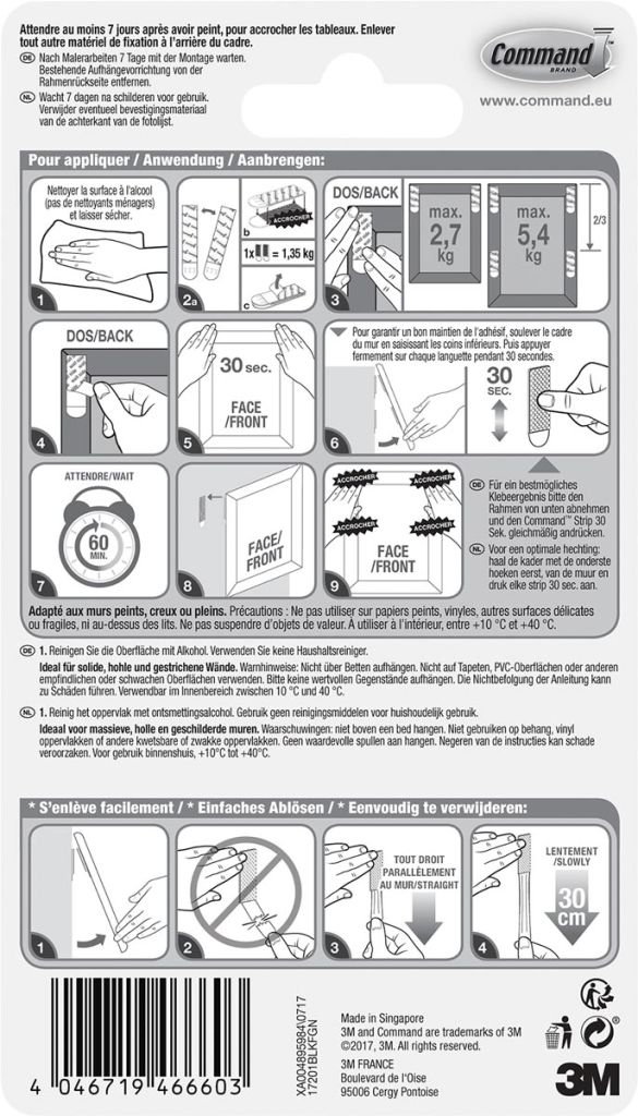 - Herbruikbare bevestigingsstrips om producten opnieuw op te hangen, om schoon te maken, de kamer opnieuw in te richten of een object een andere plek te geven