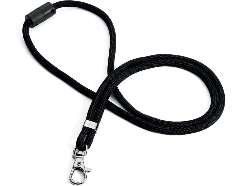 - Textielkoord gemaakt van gerecycled PET Met veiligheidssluiting, opent bij sterke trekbelasting Rondom geweven touw met karabijnhaak Ideaal voor naambadges of kaarthouders met een uitsparing of voor sleutels Ft 46 cm Pak van 10 stuks Kleur: zwart