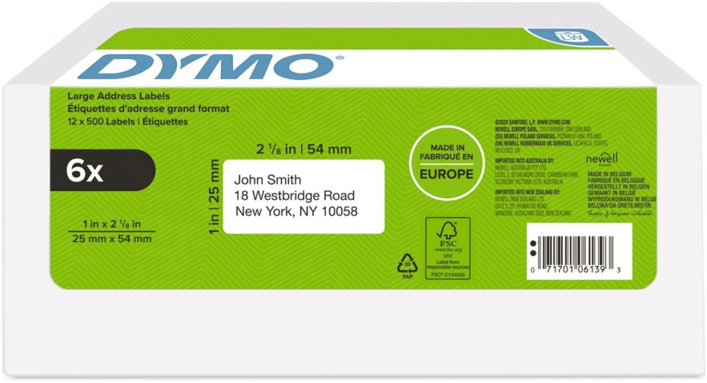 Dymo etiketten LabelWriter ft 25 x 54 mm, wit, doos van 6 x 500 etiketten