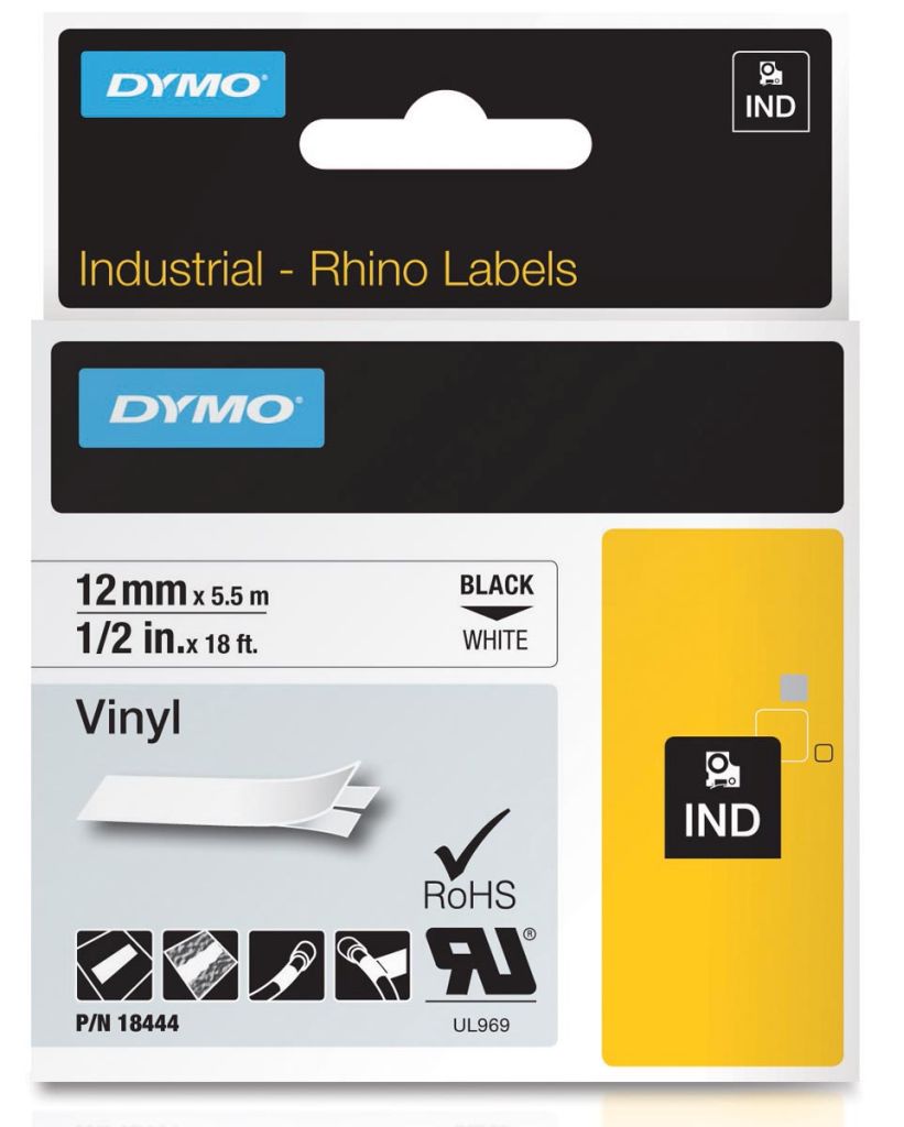 Dymo RHINO vinyltape 12 mm, zwart op wit