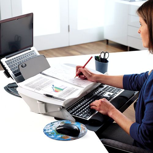Dankbare documenthouder: eenvoudige switch tussen schrijven en lezen door het uitschuifbaar platform. Dankzij een documenthouder kan men op één lijn werken en hoeft de nek - en de schouders - geen draaibewegingen te maken om documenten te kunnen lezen. Dit bevordert zowel de productiviteit als de afname van lichaamsklachten.