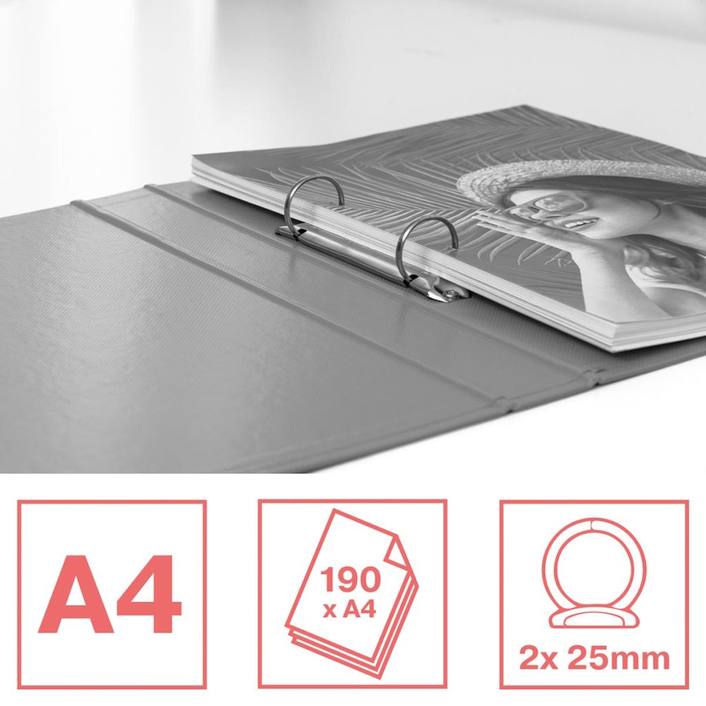 - Voor ft A4 (25,5 x 31,8 cm) Rug van 4,2 mm Uit PP met motief Met 2 ronde ringen van 25 mm Met harde kaft Met rugetiket Capaciteit: 190 vel Certificaat FSC Mix blauw