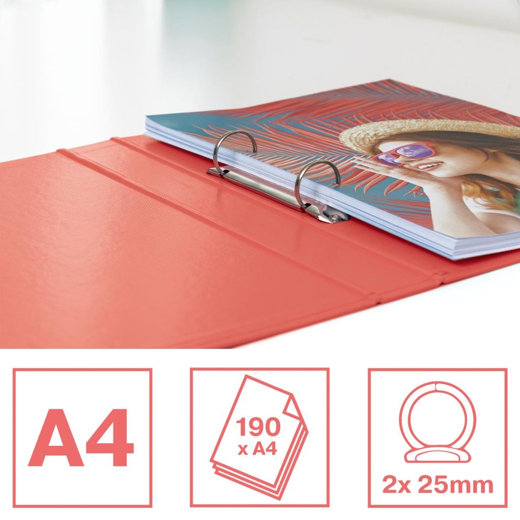 - Voor ft A4 (25,5 x 31,8 cm) Rug van 4,2 mm Uit PP met motief Met 2 ronde ringen van 25 mm Met harde kaft Met rugetiket Capaciteit: 190 vel Certificaat FSC Mix koraal