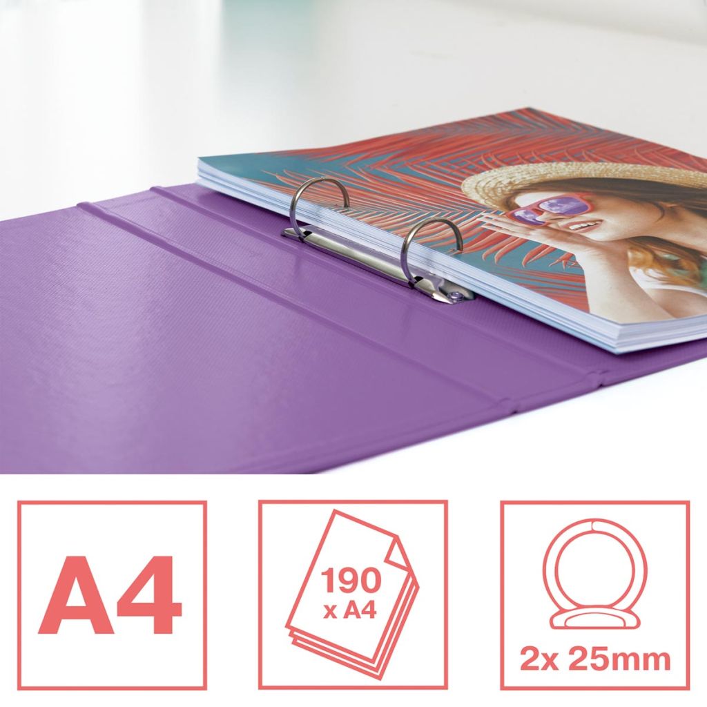 - Voor ft A4 (25,5 x 31,8 cm) Rug van 4,2 mm Uit PP met motief Met 2 ronde ringen van 25 mm Met harde kaft Met rugetiket Capaciteit: 190 vel Certificaat FSC Mix lavendel