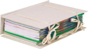 - Uit karton Voor documenten tot folioformaat Rug kan verbreed worden tot 10 cm Sluit met 2 doorschuivende linten Ft 24 x 35 cm Kleur: grijs