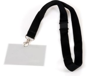 - Van helder transparant PVC Met perforatiegat voor het bevestigen van het koord Geschikt als badgehouder met kaartformaat 90x60mm Gesloten uitvoering Inclusief badgekoord kleur zwart voorzien van een metalen karabijnhaak en kunststof veiligheidssluiting(20mm breed, 44cm lang)