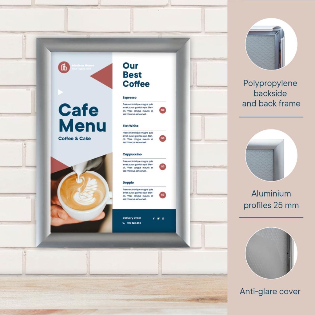 - Uit geanodiseerd aluminium met achterzijde uit gegoten kunststof Easy-Click systeem Voorzetfolie beschermd de poster tegen vuil en vocht Profiel van 25 mm met versterkte hoeken Inclusief bevestigingsmateriaal (4 schroeven en 4 pluggen) Kleur: zilver Pak van 10 stuks