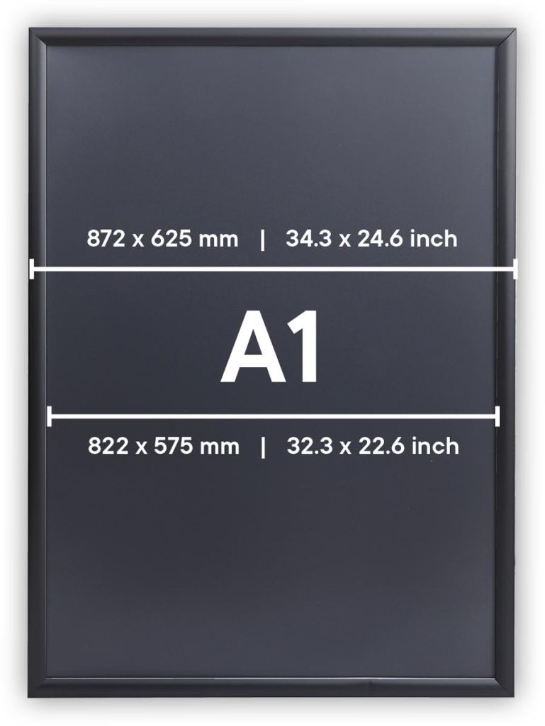 - Uit geanodiseerd aluminium met polystyreen achterzijde Easy-Click systeem Voorzetfolie beschermd de poster tegen vuil en vocht Profiel van 25 mm met versterkte hoeken Inclusief bevestigingsmateriaal A1 (594 x 840 mm), zwart