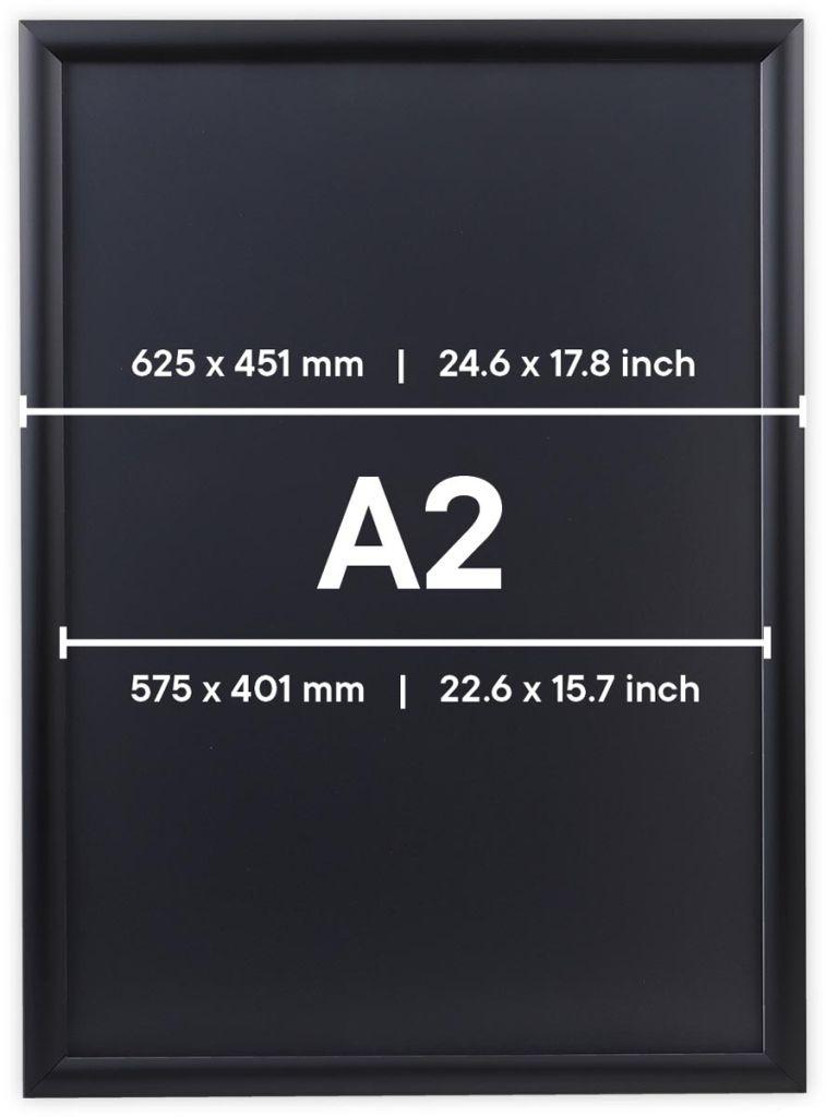 - Uit geanodiseerd aluminium met polystyreen achterzijde Easy-Click systeem Voorzetfolie beschermd de poster tegen vuil en vocht Profiel van 25 mm met versterkte hoeken Inclusief bevestigingsmateriaal A2 (420 x 594 mm), zwart