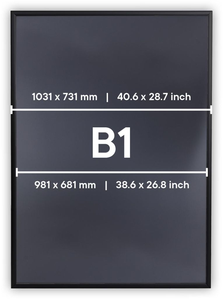 - Uit geanodiseerd aluminium met polystyreen achterzijde Easy-Click systeem Voorzetfolie beschermd de poster tegen vuil en vocht Profiel van 25 mm met versterkte hoeken Inclusief bevestigingsmateriaal B1 (707 x 1000mm), zwart