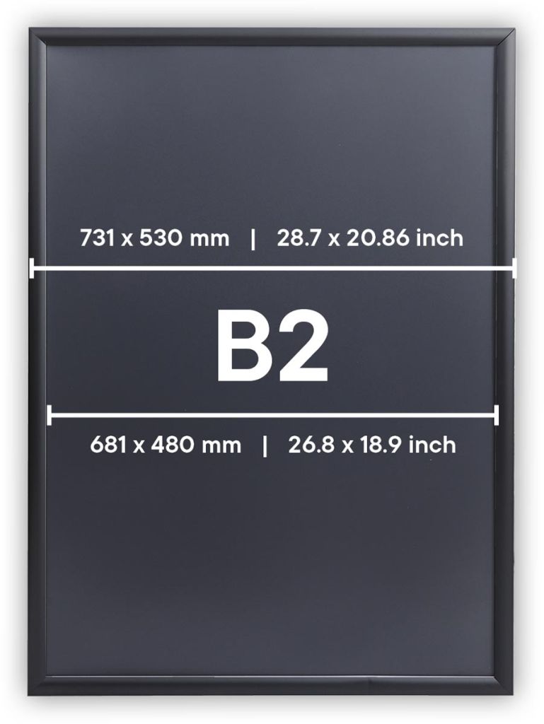 - Uit geanodiseerd aluminium met polystyreen achterzijde Easy-Click systeem Voorzetfolie beschermd de poster tegen vuil en vocht Profiel van 25 mm met versterkte hoeken Inclusief bevestigingsmateriaal B2 (500 x 700mm), zwart