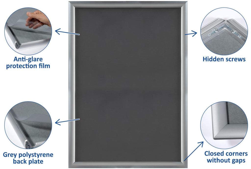 - Van geanodiseerd aluminium met polypropyleen achterzijde Easy-Click systeem Voorzetfolie beschermd de poster tegen vuil en vocht Profiel van 25 mm met versterkte hoeken Inclusief bevestigingsmateriaal (4 schroeven en 4 pluggen) ft A2, zilver