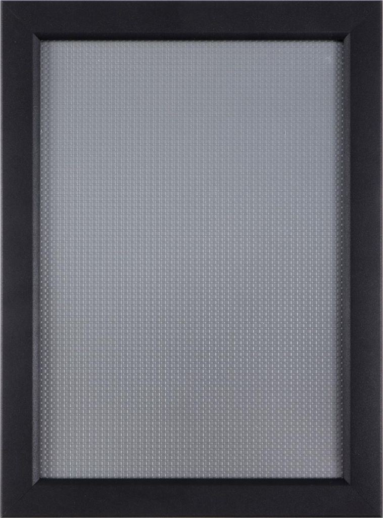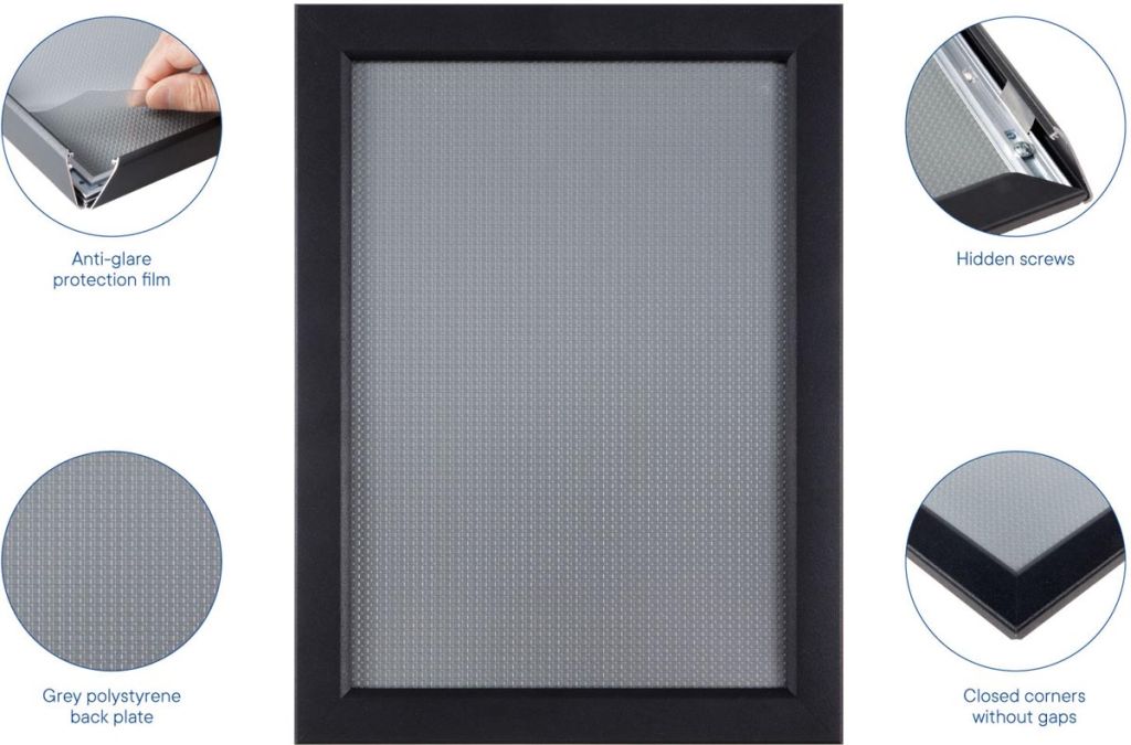 - Van geanodiseerd aluminium met polypropyleen achterzijde Easy-Click systeem Voorzetfolie beschermd de poster tegen vuil en vocht Profiel van 25 mm met versterkte hoeken Inclusief bevestigingsmateriaal (4 schroeven en 4 pluggen) ft A4, zwart
