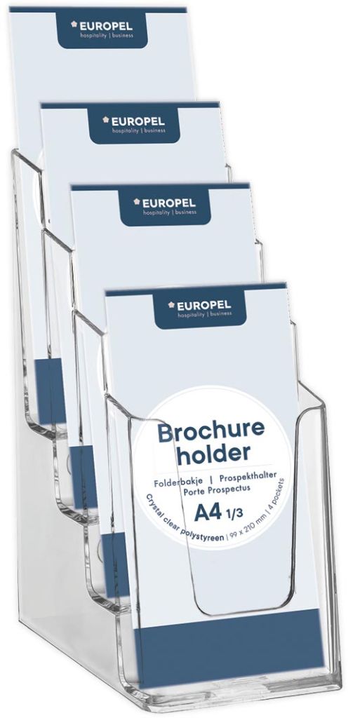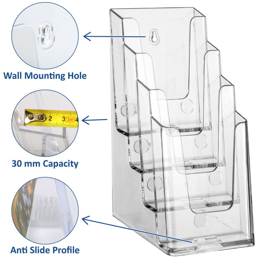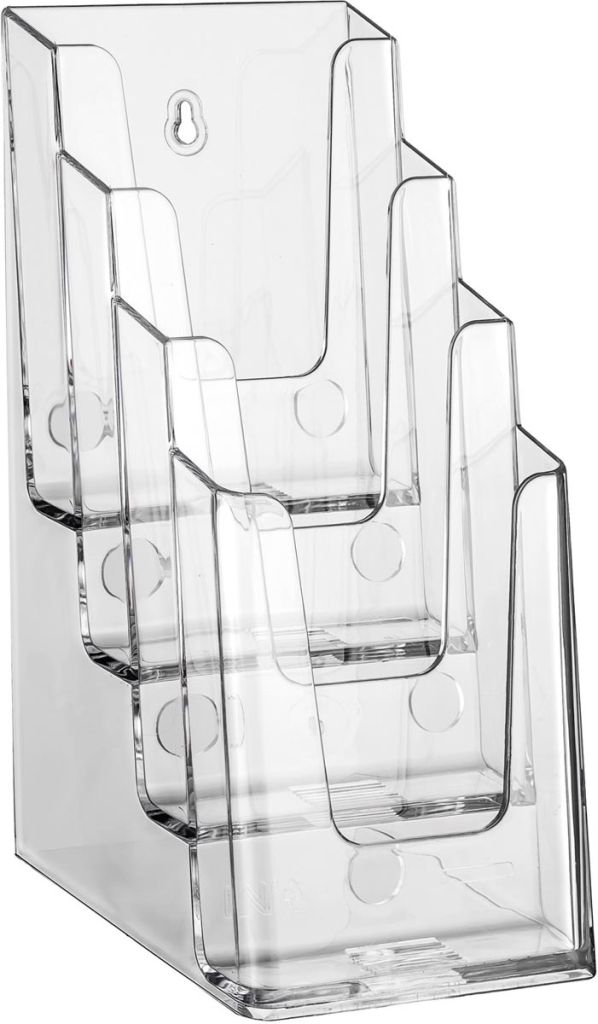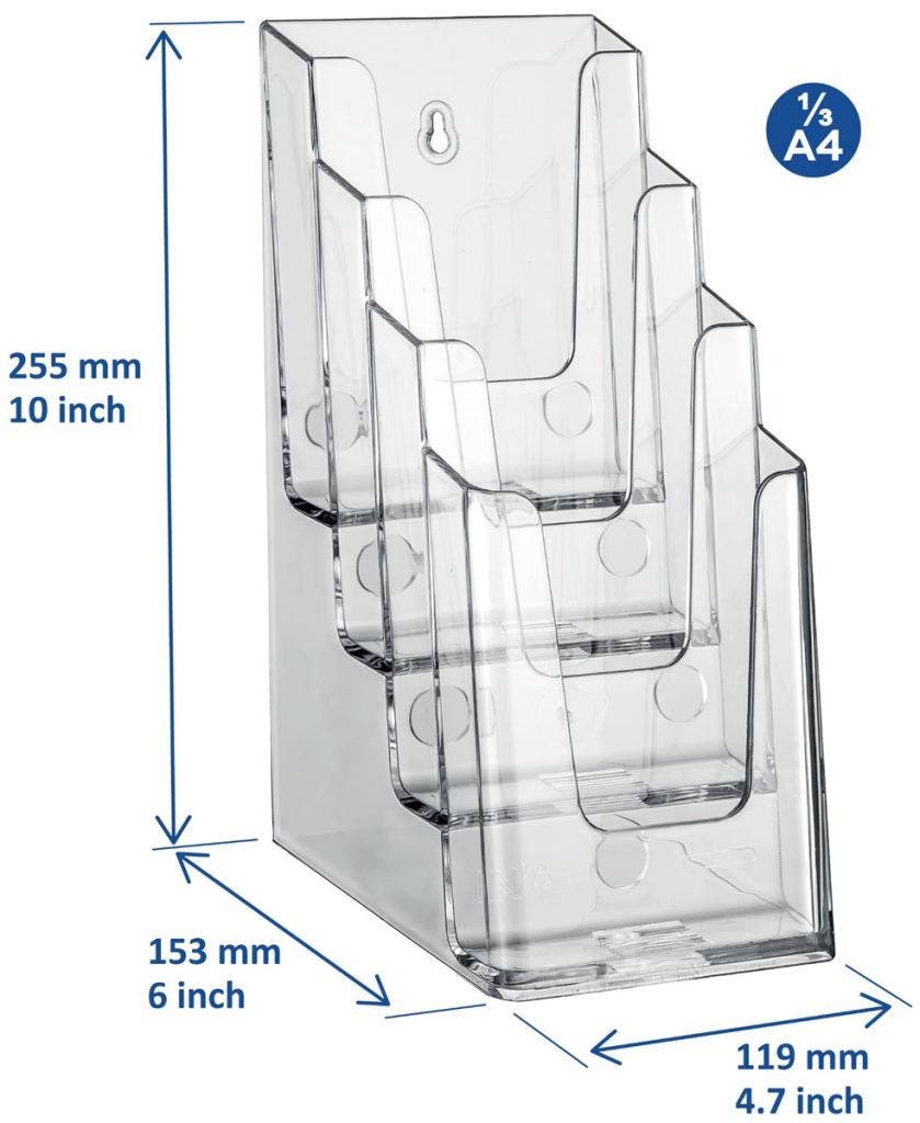 - Uit glashelder, recycleerbaar polystyreen Meervoudig bakje Ook geschikt voor wandmontage geschikt voor 4 x 1/3 A4, binnenft: 10,5 x 13,6 x 2,5 cm, buitenft: 11,9 x 25,5 x 15,3 cm (b x h x d), vuldiepte 2,5 cm