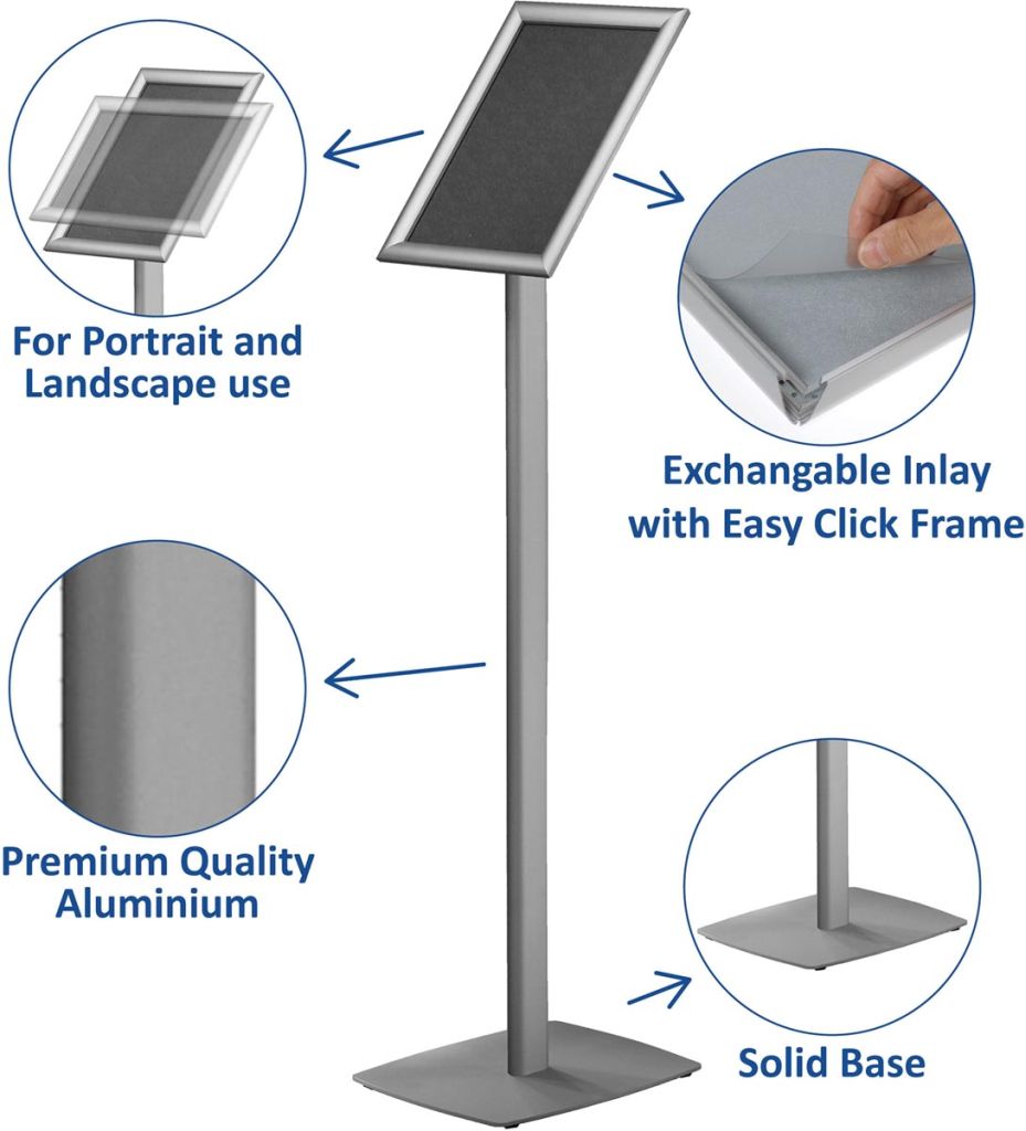 - Uit metaal Kliklijst van geanodiseerd aluminium met kunststof achterzijde Easy-Click systeem Eenvoudig te monteren De kliklijst kan zowel staand als liggend worden geplaatst Ft voetstuk: 32 x 24,5 x 0,4 cm Hoogte inclusief kliklijst: 110 cm Klilklijst gemonteerd in hoek van 38º ft A4, grijs