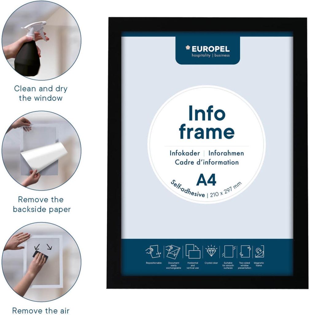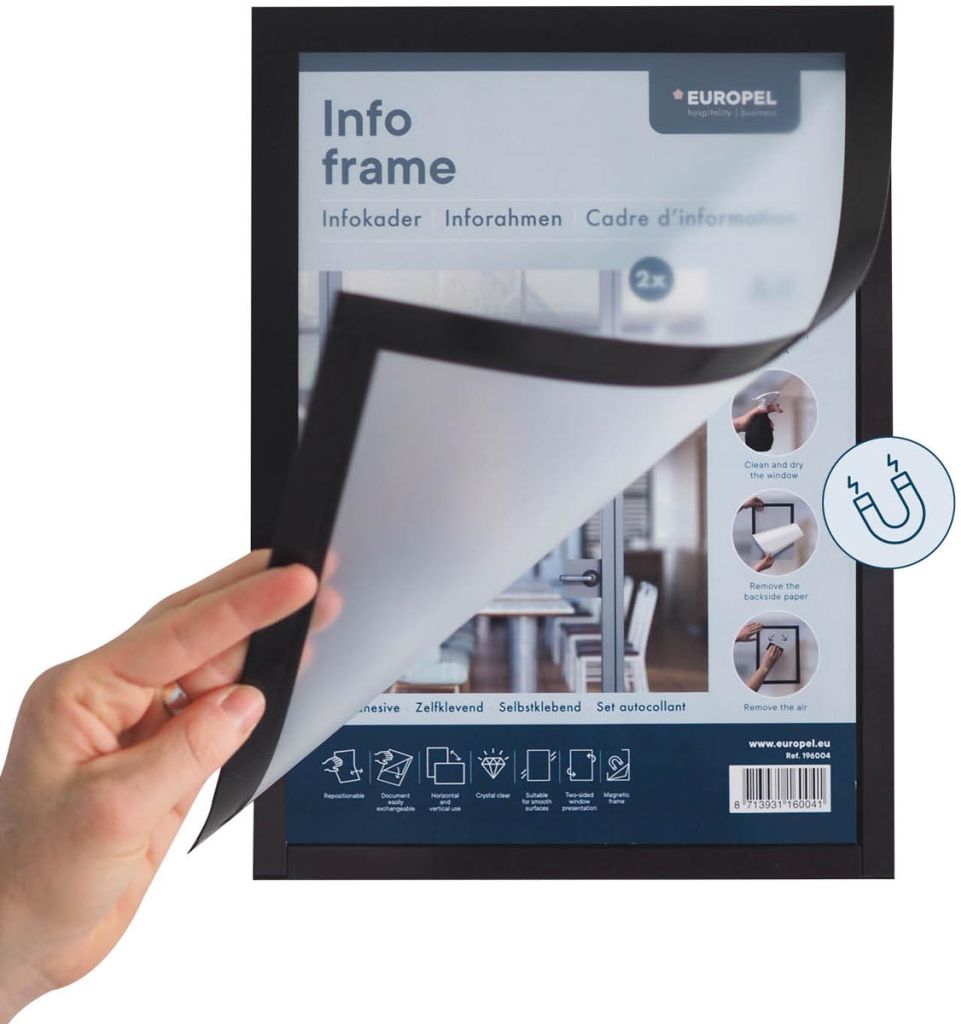 - Zelfklevende kader Document eenvoudig verwisselbaar dankzij de magnetische randen Herpositioneerbare zelfklevende transparante folie Zowel staand als liggend te gebruiken Geschikt voor gladde ondergronden Tweezijdige presentatie op glas Kaderkleur aan tweezijden zichtbaar Breedte kader: 1,8 cm Pak van 2 stuks ft A4, zwart