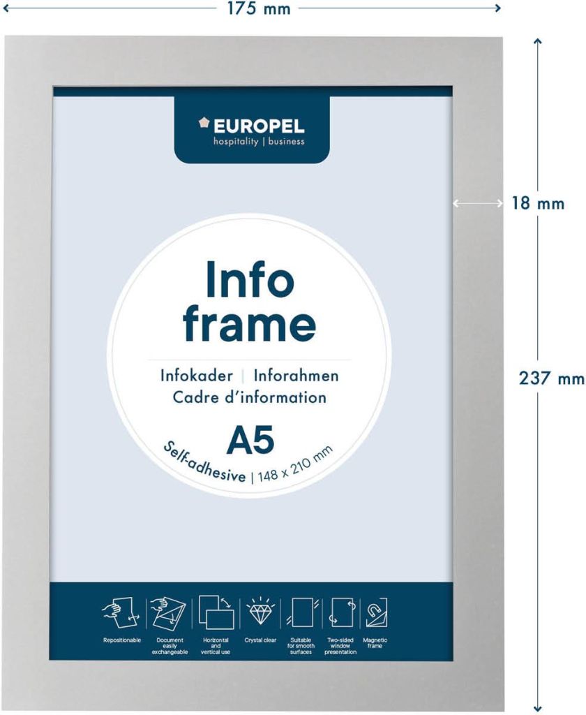- Zelfklevende kader Document eenvoudig verwisselbaar dankzij de magnetische randen Herpositioneerbare zelfklevende transparante folie Zowel staand als liggend te gebruiken Geschikt voor gladde ondergronden Tweezijdige presentatie op glas Kaderkleur aan tweezijden zichtbaar Breedte kader: 1,8 cm Pak van 2 stuks ft A5, zilver