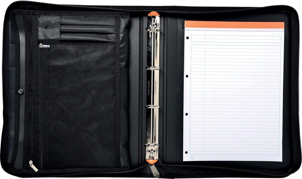 - Voorzien van plaats voor notablok ft A4 of schrift, visitekaarten, pennenhoes en vakken voor het klasseren van losse documenten
