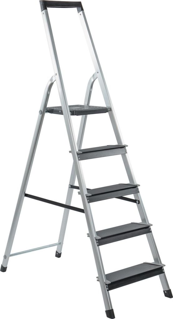 - Aluminium trapladder met brede treden Antislipplatform met automatische vergrendeling Treden zwart gecoat en dubbel gerevetteerd Met handige gereedschapshouder Profielen behandeld met vuilafstotende laag Extra brede antisliptreden in aluminium: 12 cm 5 treden